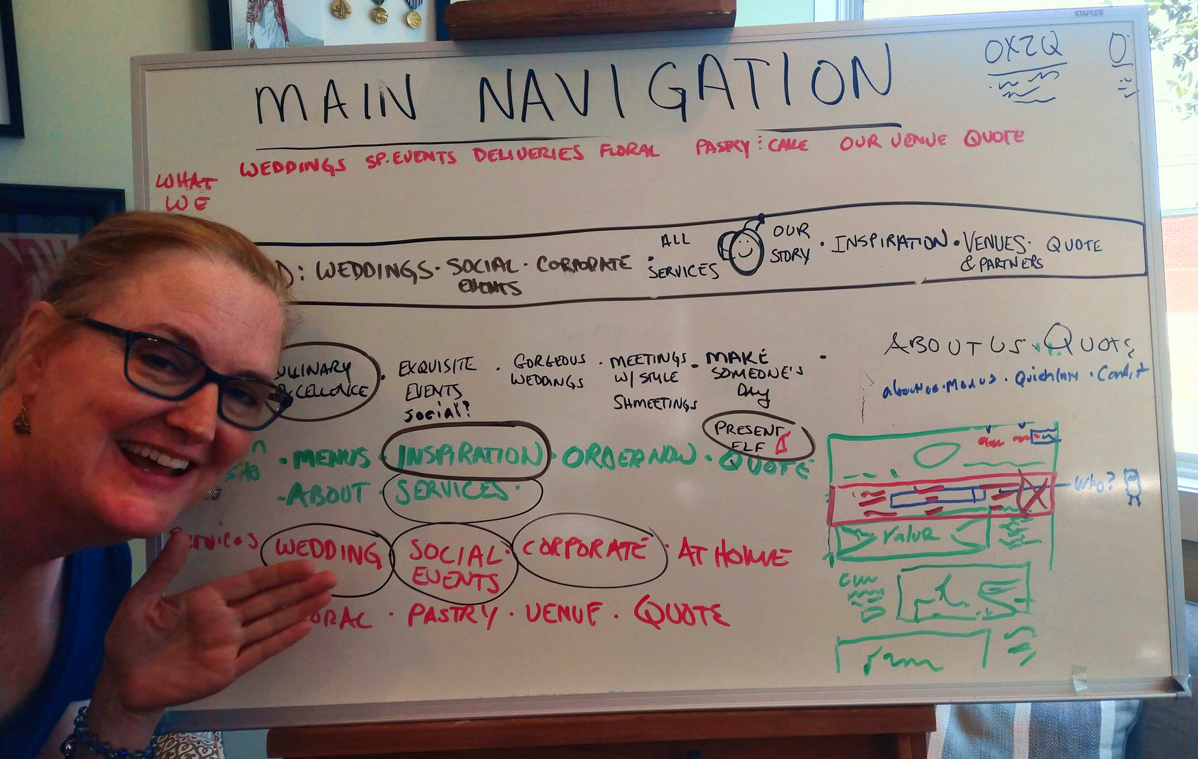 Completing the content strategy required some in-person meetings with whiteboards and sticky notes. It's a fun process to define a sitemap, but it's also draining and requires time for recharging, so being on premises of a catering company that makes a big lunch for everyone is a great way to refresh. In this sitemap session, we needed to cover some basic wire framing because the sitemap at hand was going to break Miller's law that a sitemap level cannot have more than 7 items. We solved it by breaking it into two with a center logo, thus having the perfect amount of items to communicate the complexity.