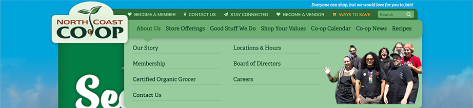The people are what makes a co-op great, so we added recognizable faces all over, including the footer and the mega-nav menu.